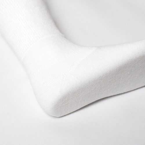Based on an L-shape that follows the shape of the human foot, it consists of a heel section with multiple three-dimensional structures, a smart cylindrical ribbed top, and flat-woven ankle sections that prevent sagging.